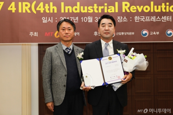 이창희 진코퍼레이션 대표(오른쪽)가 31일 오후 서울 프레스센터에서 열린 머니투데이 주최의 '2017 4IR 어워즈'(4th Industrial Revolution Awards) 시상식에서 스마트팩토리 부문 대상을 수상하고 주해종 동국대 교수와 기념사진을 찍고 있다.