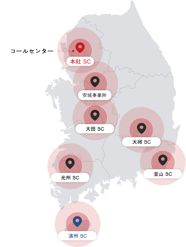現場中心の保守サービスの為に、全国総5カ所の地域にコールセンターを運営中で中央管制センターの迅速な情報伝達をパターンに1年365日メンテナンスサービスをサポートしています。